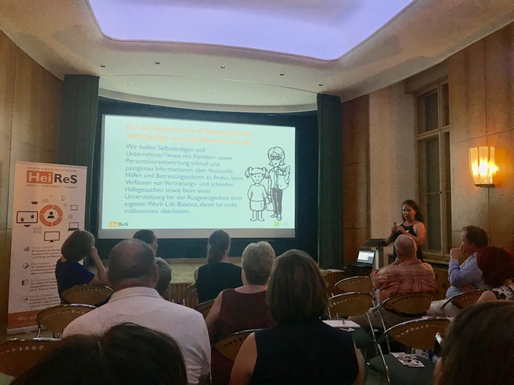 Der Hauptteil der Veranstaltung war natürlich der Präsentation unserer Ergebnisse zur digitalen Lösung zur Verbesserung der Vereinbarkeit von Familie und Beruf gewidmet und insbesondere den darauf folgenden Dialogen und Diskussionen. Gerade das Feedback aus den direkten Antworten und Gesprächen danach ist uns unglaublich wichtig. Wir haben viele unserer Vorschläge sogar zur Abstimmung gegeben, damit die Meinungen wirklich einfließen. Die Präsentationsgespräch wurde geleitet von Peggy Reuter-Heinrich und Lars Heinrich als Initiatoren sowie Gesellschafter-Geschäftsführer HeiReS, die 100% hinter dem stehen, was hier mit Förderung des Landes Sachsen entsteht. Peggy in der ihr eigenen Art mit bildintensiven Powerpoints unterstützt die Präsentation gehalten und Lars hat die Dialoge mit Fragen und Moderation angeregt. Dabei wurden die Themenfelder Nutzer und Problemlösungen, das Struktur und Inhaltsumfang, verschiedene Design-Vorschlag sowie das Zeigen der ersten echten Software angegangen.