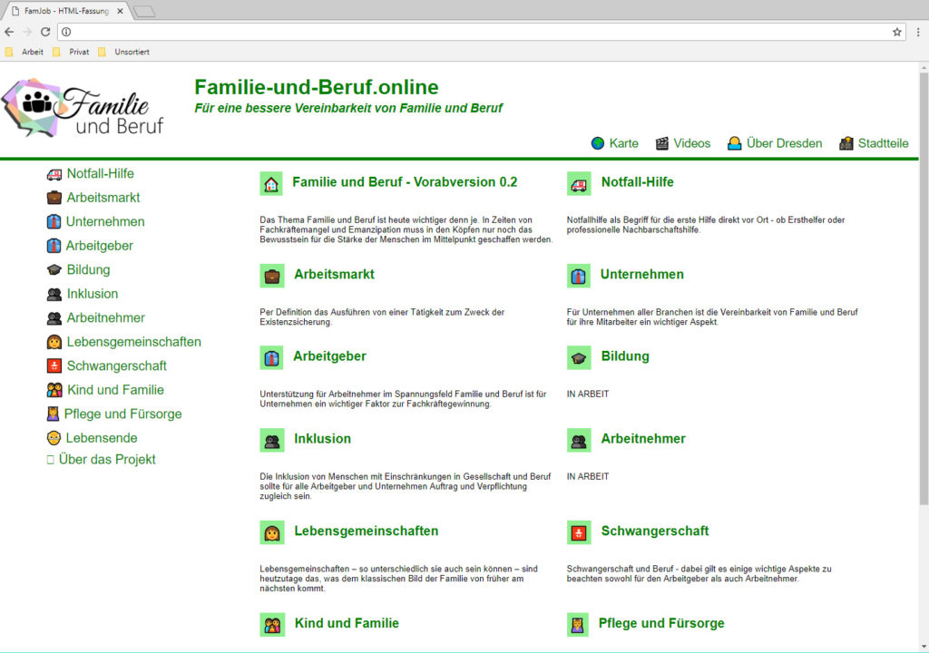 Auf dem zweiten Event zum Projekt zur besseren Vereinbarkeit von Familie und Beruf haben die interessierten Besucher ja bereits einen ersten Blick auf die Webseiten-Version unserer kommenden Plattform werfen können. Nun – knapp 6 Wochen später – freuen wir uns sehr auch der Öffentlichkeit einen Blick in die Baustelle geben zu können. Wobei der Begriff Baustelle hier eigentlich nicht mehr passend ist. Wir sind mit der Verfügbarkeit der Daten als Webseite sowie deren Anpassung in Design, Usability und sogar Barrierefreiheit schon ein großes Stück voran gekommen.