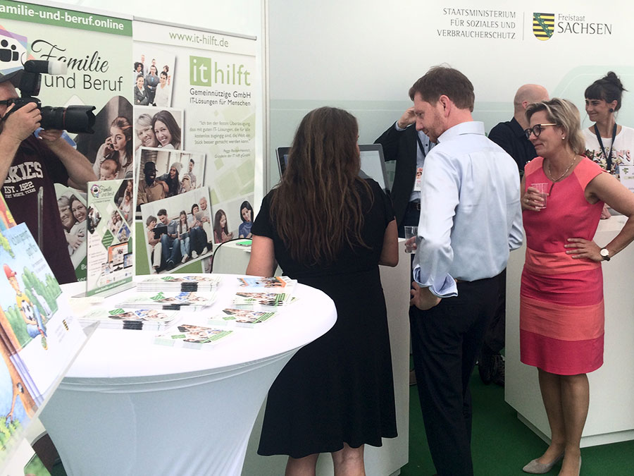 Mehr als 12.000 Besucher kamen am 22. Juni auf Einladung des sächsischen Familienministeriums zum Familientag in Wurzen. Peggy und Kati von der gemeinnützigen IT hilft gGmbH waren am Stand des Staatsministeriums für Soziales und Verbraucherschutz dabei. Präsentiert wurde die digitale Lösung zur Vereinbarkeit von Familie und Beruf – das Ausprobieren der Lösung am großen PC-Bildschirm war dabei ein Highlight.