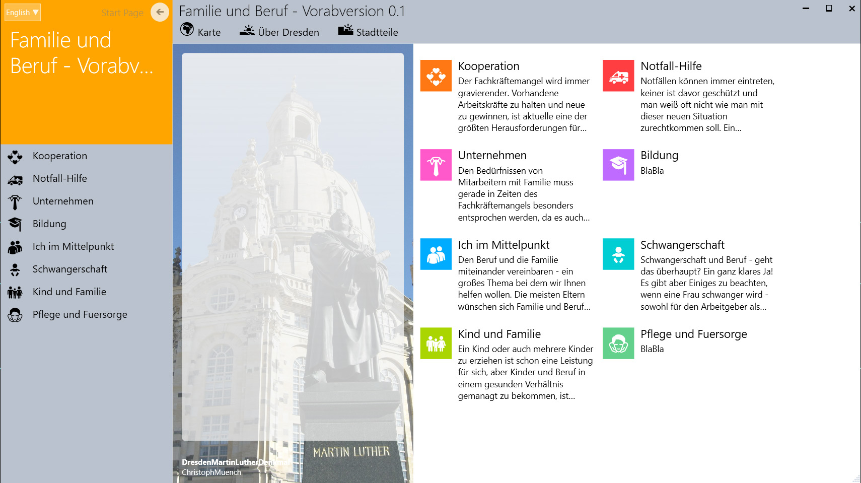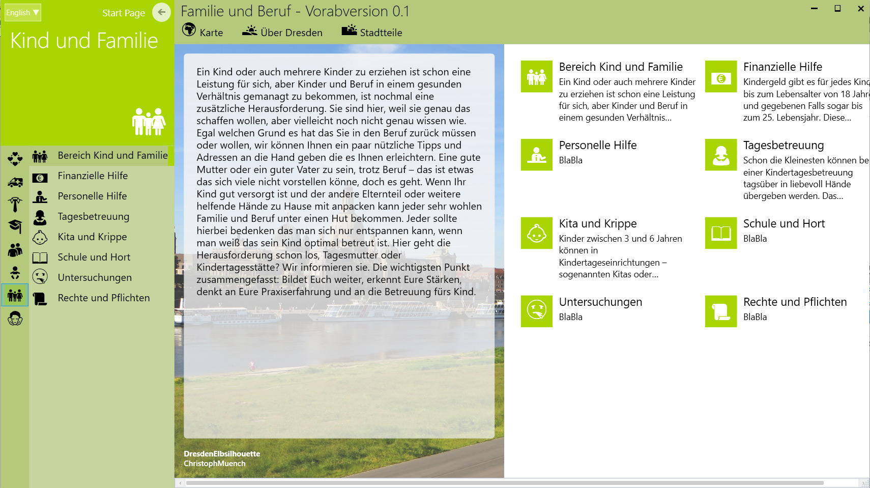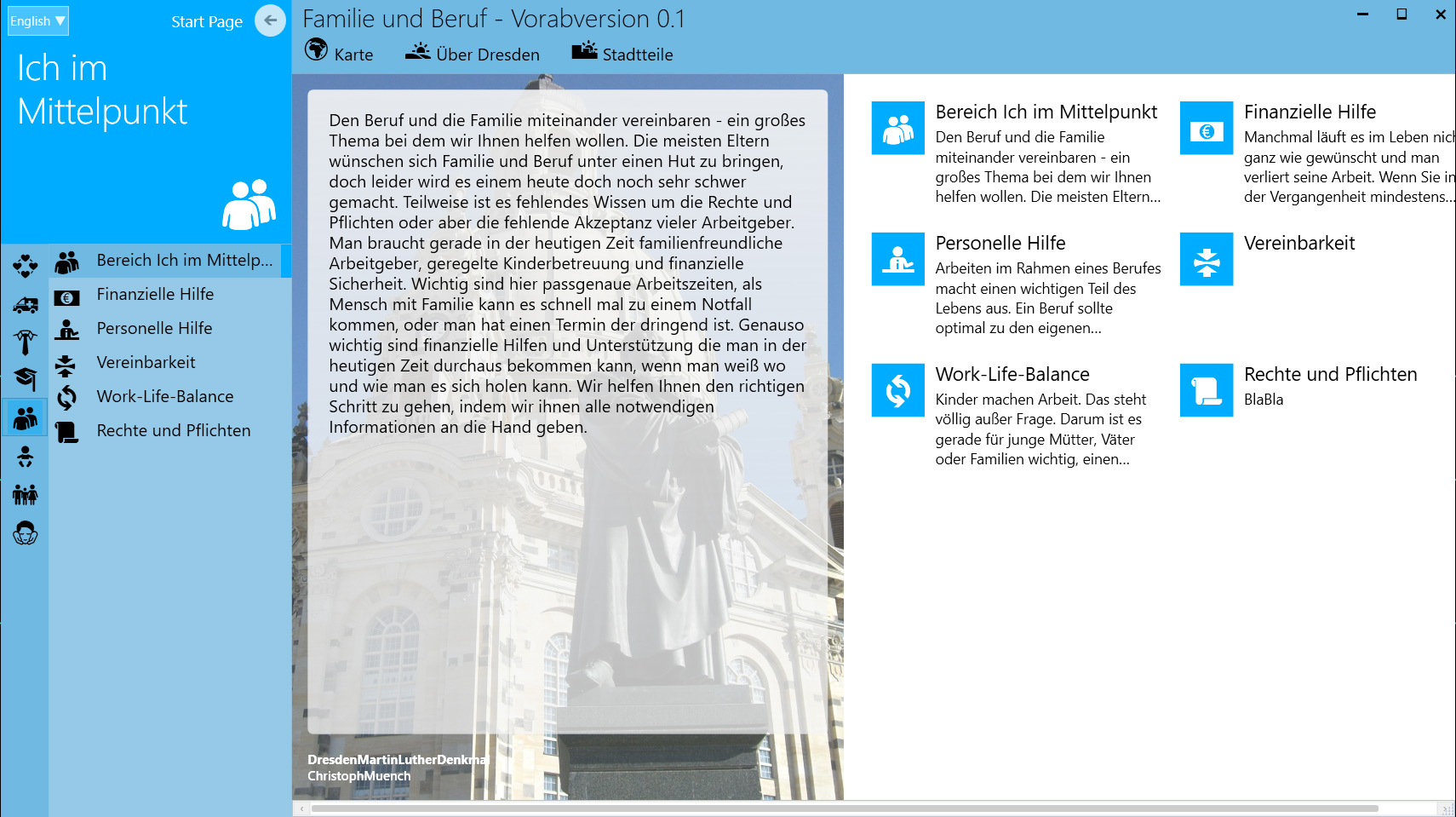 In der Vorabversion bereits gut erkennbar sind neben Interaktion und Design auch die breit gefächerten Themengebiete und Kategorien, in denen die Lösung zukünftig sehr viele und hilfreiche Informationen rund um das Thema Familie und Beruf anbieten wird.